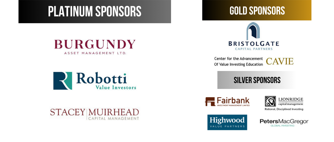 We would like to thank our donors for their generous support. Platinum Donors: Burgundy Asset Management Ltd., Robotti & Company Advisors, and Stacey Muirhead Capital Management. Gold Donors: Bristol Gate Capital Partners Inc., and The Center for the Advancement of Value Investing Education. Silver Donors: Fairbank Investment Management Limited, Highwood Value Partners, Lionridge Capital Management, and Peters MacGregor Capital Management.