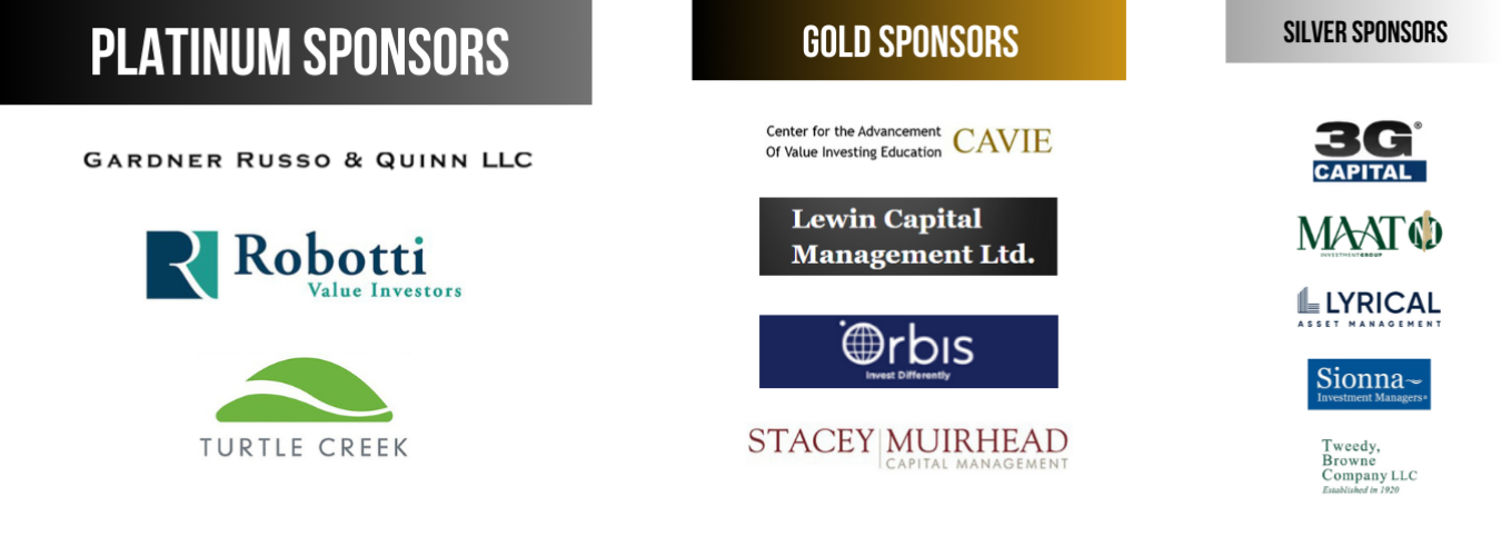 We would like to thank our donors for their generous support. Platinum Donors: Gardner Russo & Quinn LLC, Robotti & Company Advisors, and Turtle Creek Asset Management Inc.. Gold Donors: The Center for the Advancement of Value Investing Education, Lewin Capital Management Ltd., Orbis Investment Management, and Stacey Muirhead Capital Management. Silver Donors: 3G Capital Management LLC, Lyrical Asset Management, MAAT Investment Group, Sionna Investment Managers, and Tweedy, Browne Company LLC.